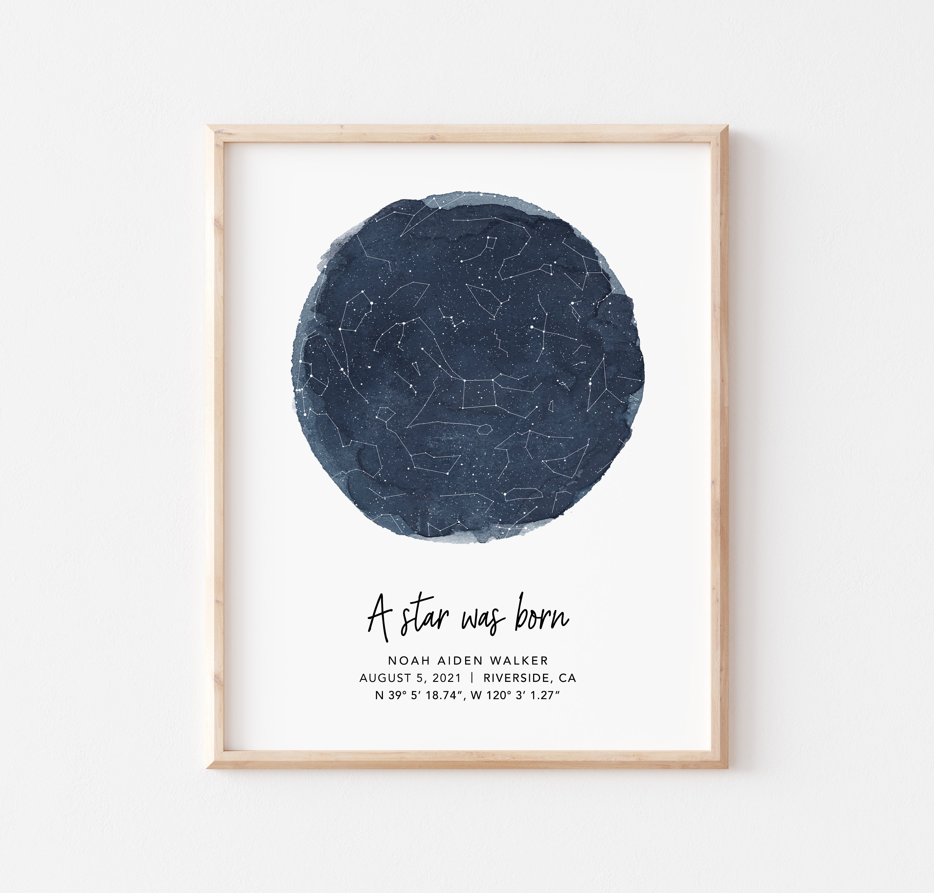 A Star is Born Star Map, Birth Date Star Map for New Baby, Night